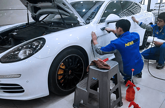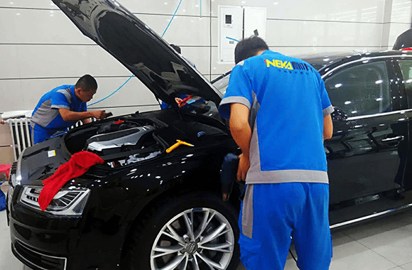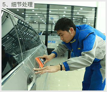 耐卡店面配备有标准的无尘式车间,阉割按照封闭无尘的国际专业标准。主要设施有封闭车间、喷淋式除尘设施、空气加湿器、空调等减少灰尘进入到膜与玻璃间的概率,加上车间内密集的灯光照明系统,确保专业技师在充足光照下的准确到位,施工车间用透明玻璃进行隔断,一方面保证汽车贴膜施工质量,另一方面,也让车主对贴膜施工的实际进程有详细的了解。